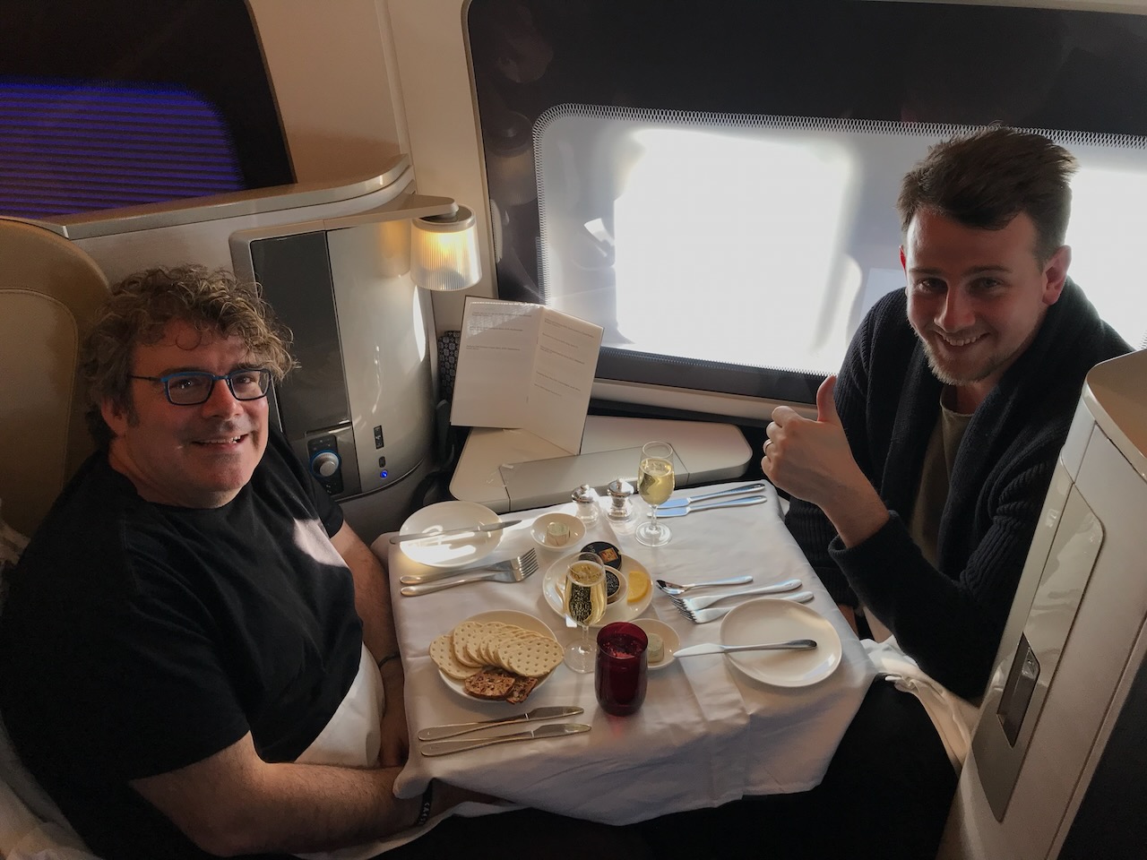 Yes, domestic. Yes, First. Yes, I brought blinis… and yes, we warmed them in the galley. Respectfully. Efficiently. Like adults.