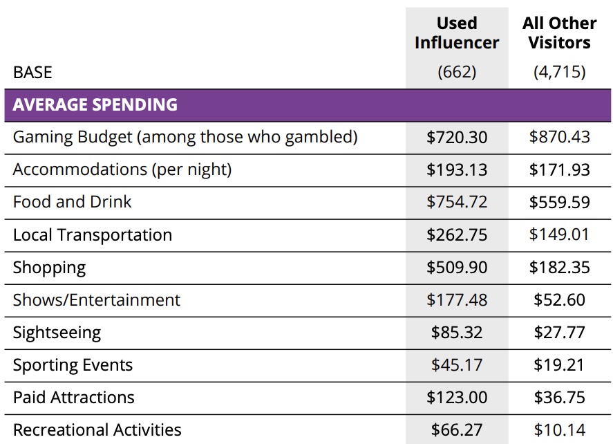 Another interesting point was influencer impact. Only 12% of visitors said they engaged with influencer content before visiting Las Vegas, but those who did were far more likely to increase their spending.
