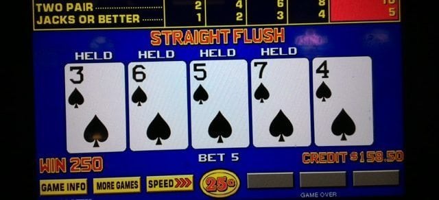 My mom played slots behind me and I hit a straight flush right away. Yay! A technician came over and turned on one of the four machines for a player who must have reserved it–to play KENO–on one of a diminishing number of full pay video poker machines in the casino.