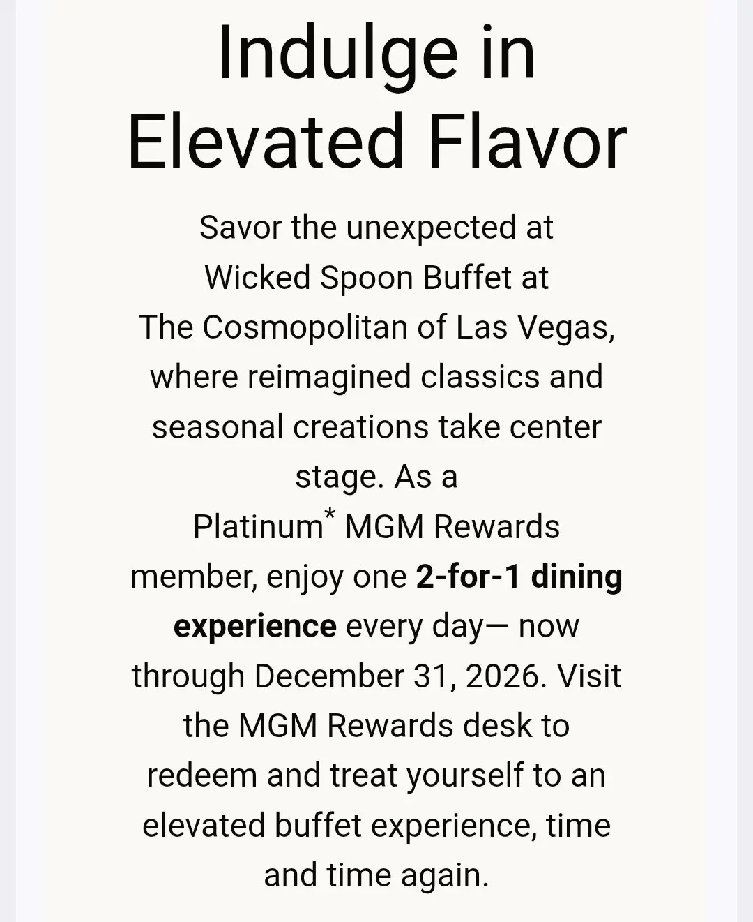 For even more value, Amex lets you add your MGM Rewards loyalty information to the booking, which may grant additional Tier Credits and MGM Rewards points and should stack with status benefits. Most notably, I’ve been receiving offers for daily BOGO Wicked Spoon Buffet thanks to my MGM Rewards Platinum status. MGM Gold status gets a BOGO buffet offer once per month. If staying at Cosmopolitan with FHR, I should almost certainly be able to charge the buffet to the room, and the $100 credit should cover it.